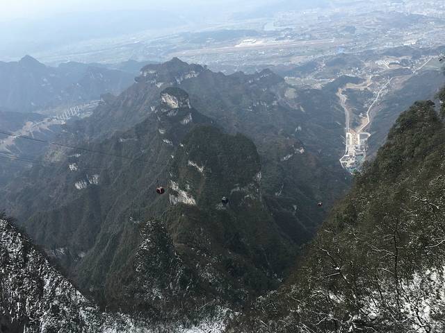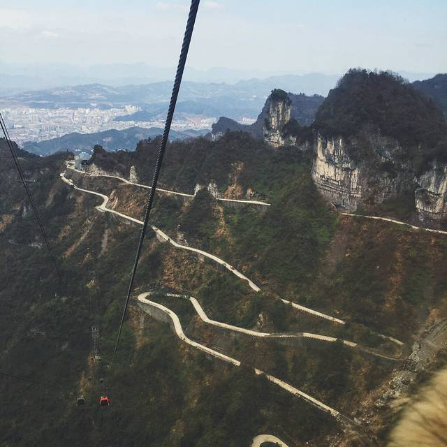天门山索道是世界最长的高山客运索道 一个缆车坐八个人 单程大概二十多分钟 开始蛮平缓的 后面开始上山就很陡了 中途有一段缆车前后摇摆 (年龄有点大的我们 小心脏好像有点受不了) 下面就是九十九道弯 在高处看更明显