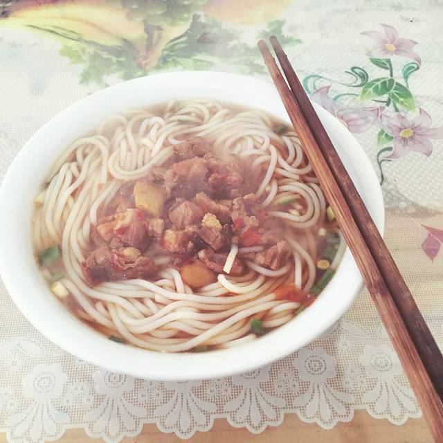 11:39从长沙到张家界的火车 所以早上起来后收拾好东西退房后就出发去火车站了 在路上吃了一碗秘制牛腩砂钵粉 这个粉是类似河粉那种宽的 12元/份 味道还不错 ~