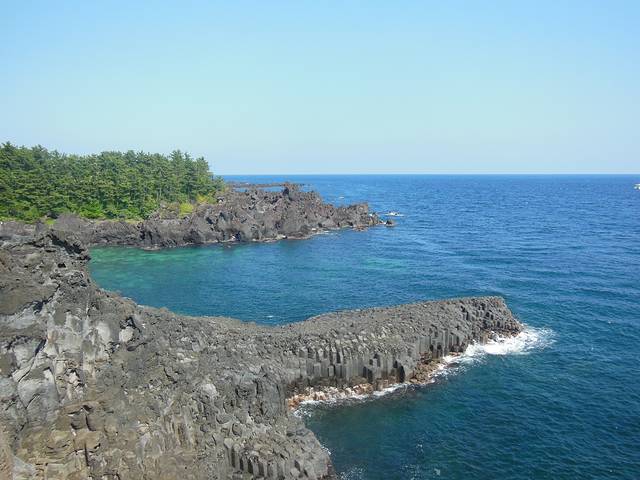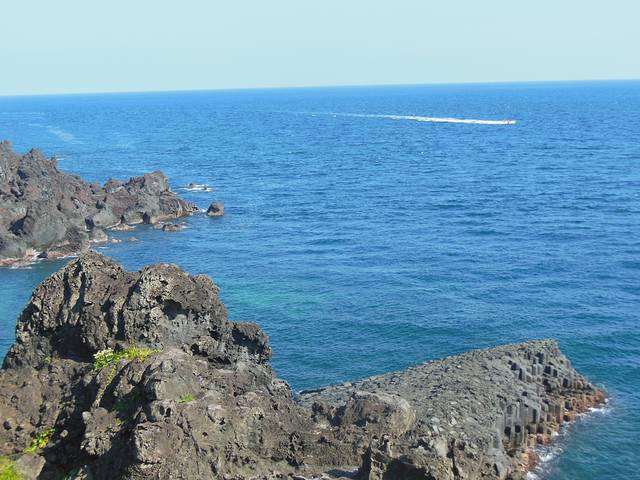 柱状节理带,是岩浆从火山口喷出,遇海水急速冷却收缩形成的,高约30~40米,宽约1000米,很壮观。