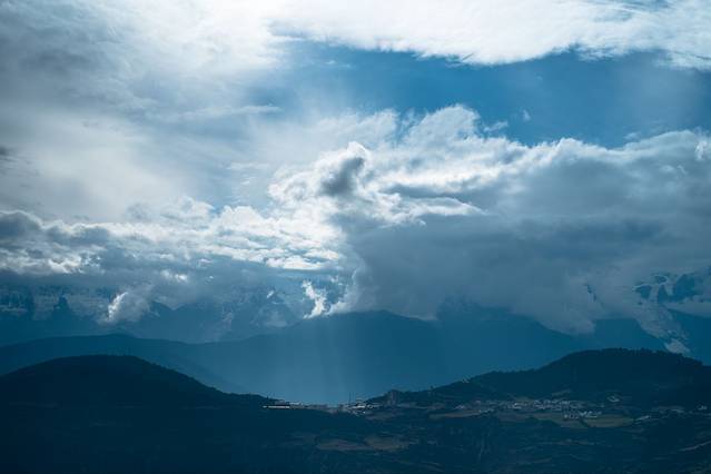 一晚火车到攀枝花然后大巴到丽江,200多公里硬是走了快8个小时吧。不过在经过永胜县的时候,翻过几座3000米左右海拔的大山突然眼前呈现出一片被群山环绕的大平原,阳光透过山顶斜射在金黄色的平原上,饭点炊烟若有若无的缭绕着,卧槽当时就想跳下车赶紧拍一张,可惜班车你们懂的,除去烂路这个因素之外这个地方真心美不胜收。