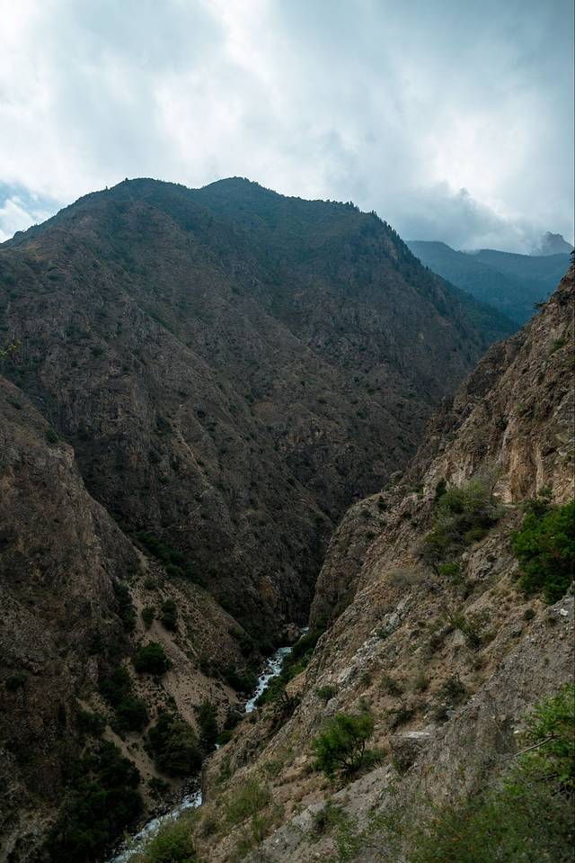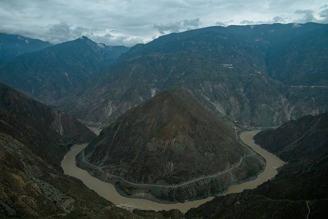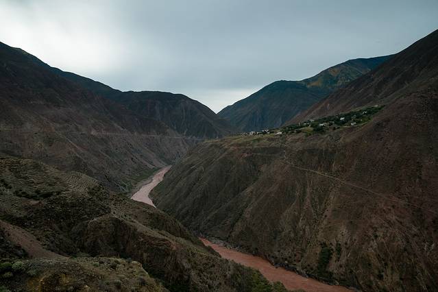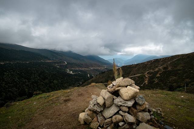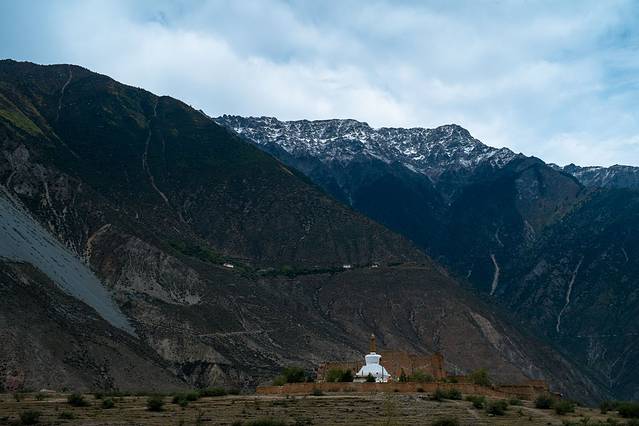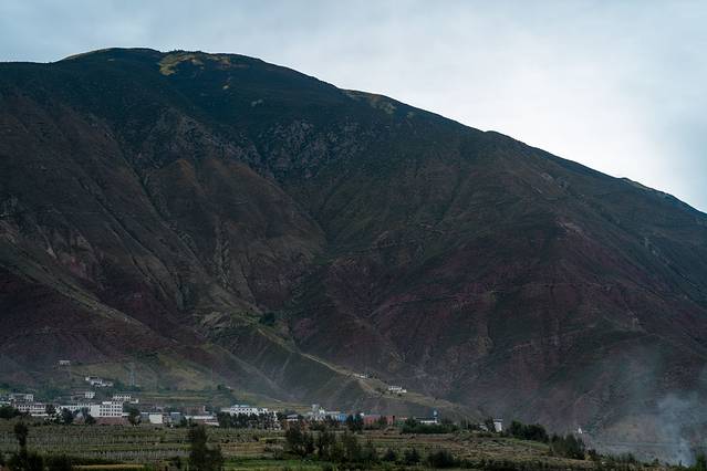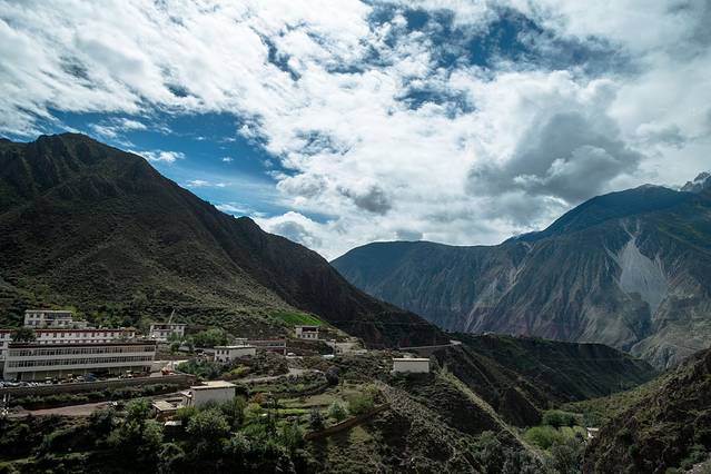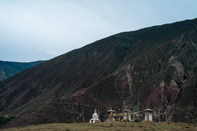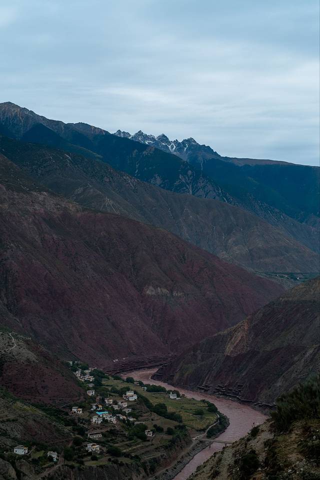 今天出发去盐井盐田,一大早看到天空被云层笼罩顿时就各种烦躁起来,也不知道是台风还是什么反正这次来藏区天气一直都是这样的坑爹。通过昨天的摸索小伙伴和我顺着下盐井村的路一路向前,爬上了一座有白塔的山坡来观察地形,旁边悬崖的下面就是咆哮的澜沧江,而远处山谷谷底就是今天的目的地盐田。