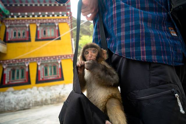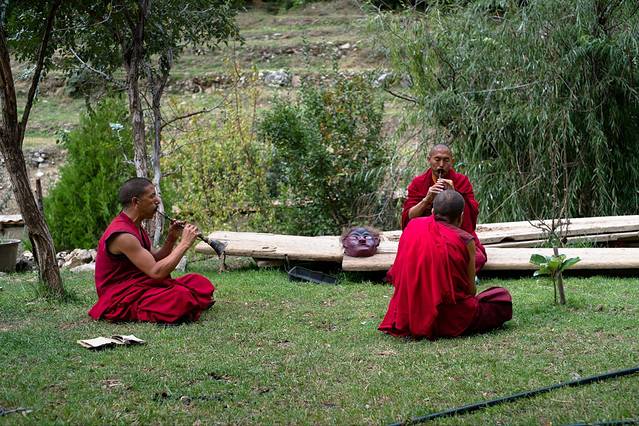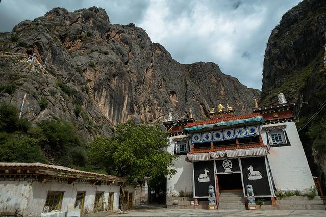 回来的路上心血来潮去找文成公主庙,虽然这个“旅游区”各种牌子但是实际上真心没游客,要不直接飞来寺到芒康转318,要不就飞来寺回去了,我和小伙伴走进214旁边的一个峡谷步行了1公里多之后到达岗达寺,里面就我们2个游人。喇嘛们辩经的辩经,吹唢呐好吧可能是另一种乐器的在练习吹那东西,实习小喇嘛则调戏着猴子吃着鸡爪,小伙伴见那边有一堆苹果问能卖么小喇嘛直接说你随便吃……
