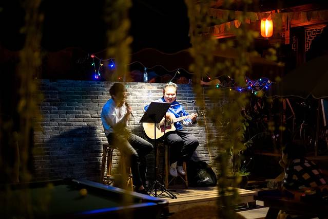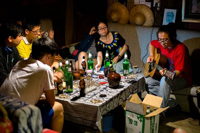 在998遇到的小伙伴们,浪哥喝了点小酒之后开始自弹自唱,miles 和 melojiji 一边和一边听,GLG 蜷缩在毯子下面拍照 lol