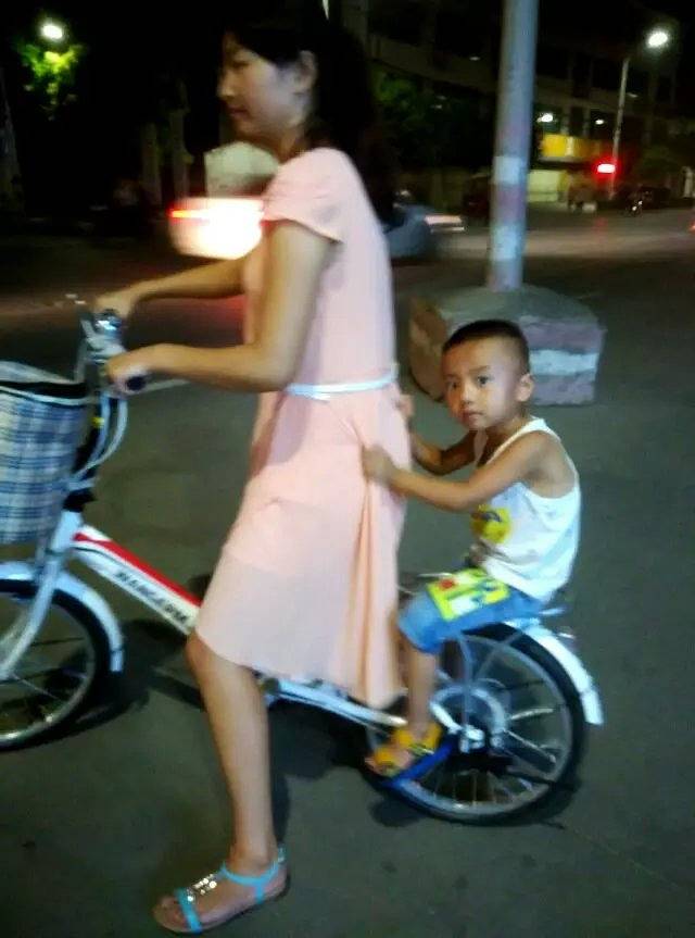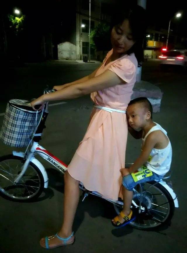 小姨的新自行车,我坐在后座,麻麻载我,至于我那腿长的小姨 就跟着后面跑吧,健身!减肥!