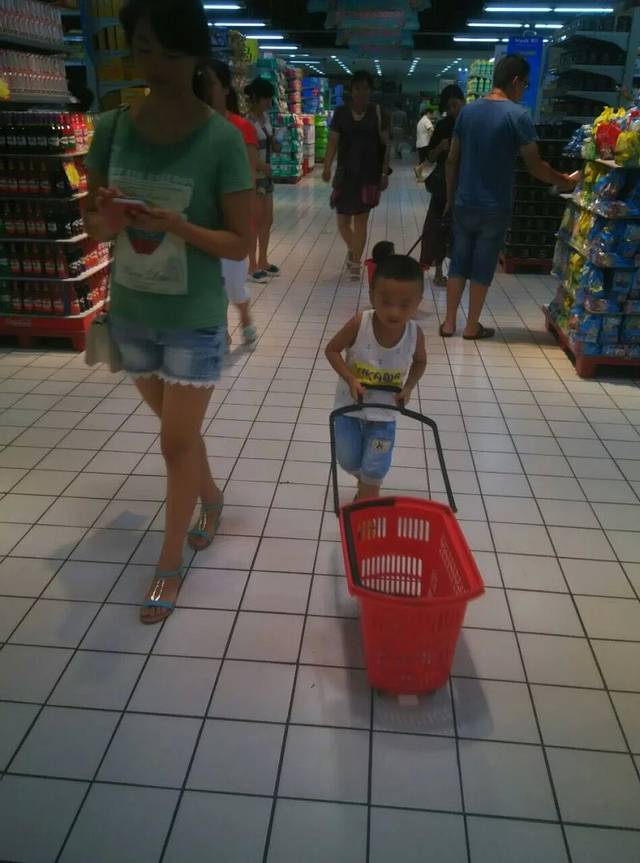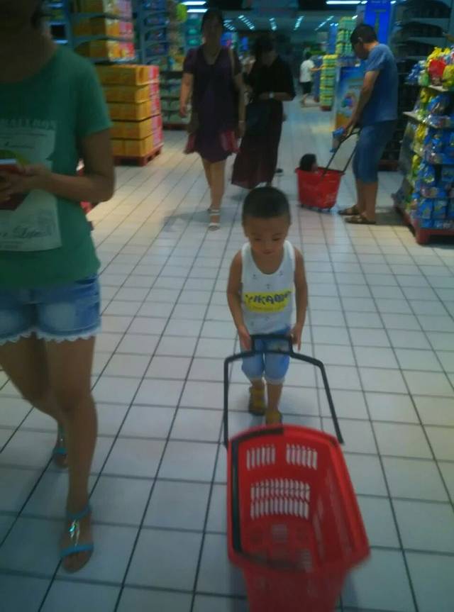 我们把东西放好,就出门逛超市了,这家好邻居超市好大,地方很宽敞,比我家附近的那家店好多了,大城市果然不一样!!一如既往的喜欢这个带滚轴的篮子,真想坐在里面让小姨拉着我逛!!