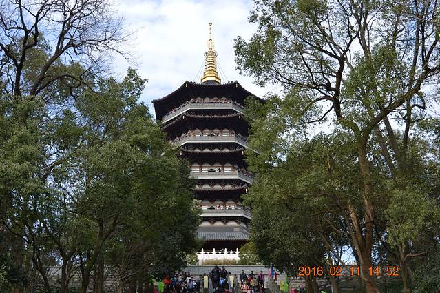 远看的雷锋塔。汉族民间故事《白蛇传》中,法海和尚骗许仙至金山,白娘子水漫金山救许仙,被法海镇在雷峰塔下。后小青苦练法力,终于打败了法海,雷峰塔倒塌,白素贞才获救了。