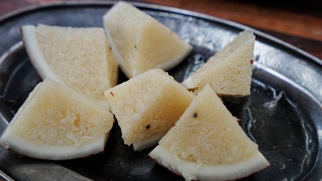 海南著名的椰子饭,值得品尝,一般都是一个椰子一份卖的,不好单卖。正好我们旁边桌也是小夫妻俩,我们两家拼了一份。糯米的绵软加上椰子的清香,回味无穷。超市也有卖这个的,真空包装,里面是去掉皮的椰子肉包着糯米饭,微波炉加热后切开来就能吃。我们走之前去超市买了好多,有的送人,有的自己吃,非常有特色。
