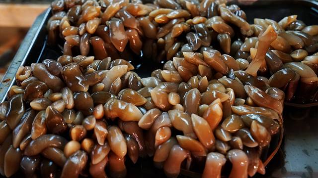 这个奇怪的一捆一捆的东西叫蛏子王,也叫竹蛏,和普通的蛏子可完全不一样,普通的蛏子我们在家也经常去超市买来辣炒,虽然很好吃,但肉很少,沙子挺多。这个竹蛏因为两壳合抱后呈竹筒状得名,肉特别多,味道鲜美,而且非常干净。不过这种东西在内地尤其是北方很难买到,即使有价格也很贵。