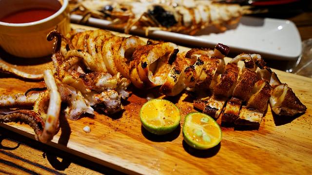 碳烤大章鱼,火候适中,口感软韧,撒上一点柠檬水,再蘸上配料,味道不错。
