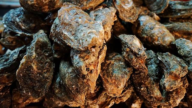 这个就是生蚝啦,像一块块疙疙瘩瘩的石头,没有烧烤的时候露出肉嘟嘟的样子那么好看。不过虽然长得难看,但是里面的肉质特别鲜美,在北京的时候也经常吃碳烤生蚝,这么大的差不多要8-10元一个,但绝对没有这么新鲜。