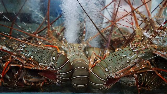 这就是大龙虾,有好几种颜色,什么澳龙、青龙、花龙的,长得差不多,就是颜色和大小不太一样,我们也傻傻分不清楚。