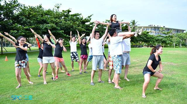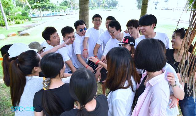 吃好,玩好,也得完成这次来的主要目的,企业文化建设重要的一块,团队建设,NIM 在这方面做的还是很不错的,每年各个部门都会进行这样或者那样的 TB,而我们这次显得更专业一些,特意请了专业的教练来帮助我们一起做拓展,上午的天气本来是多云的,后来中午暴晒,大家也是累的够呛,先来看看上午的项目,活动热身就是:信任!所有人围成一圈,紧靠前人的脚后跟,然后一起坐在后面的人的腿上,并且双手张开,人往后倒,保持10秒钟。