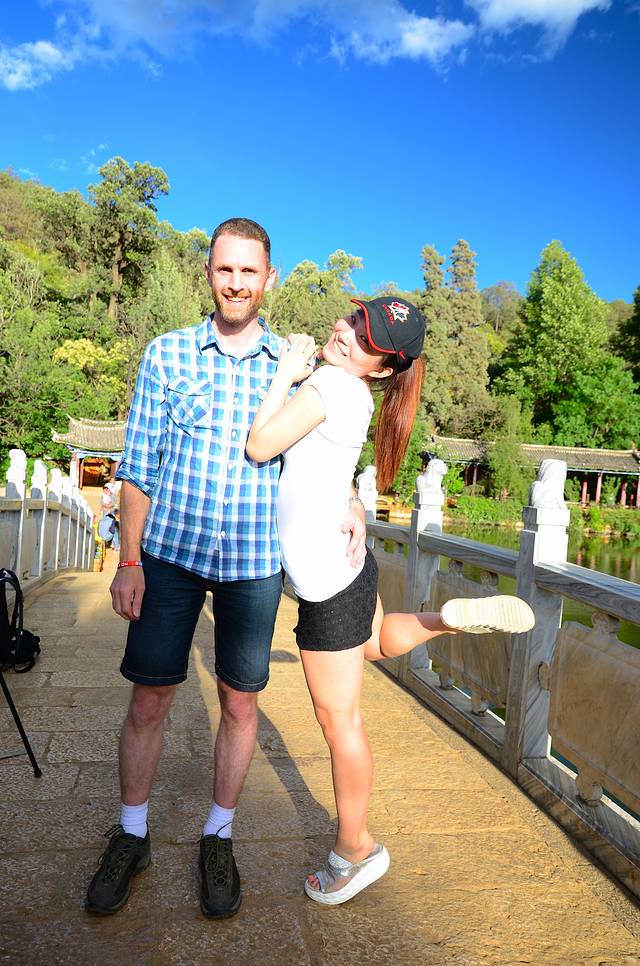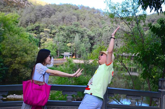 老外也挺配合的,反正你,我都开心,皆大欢喜的黑龙潭石桥上的偶遇