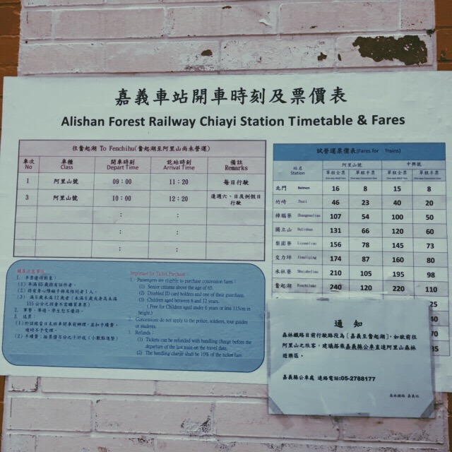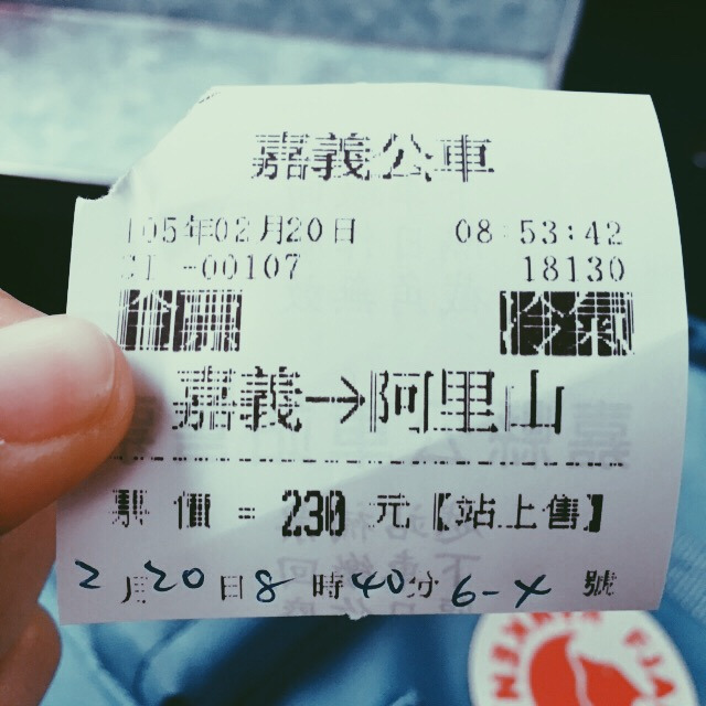 一大早,定了六点的闹钟,起床洗漱完毕后,便下楼集合出发。从云科大走到斗六火车站差不多需要20-30分钟的路程,从斗六到嘉义的火车票是46台币,差不多是9块人民币,搭乘七点二十五的火车,由于坐的是区间车(区间最慢,站站停,自强最快,但是贵!)八点十五我们便抵达嘉义。出了车站,本来打算做阿里山小火车去阿里山,可是没有直达,我们便在火车站附近的台湾好行坐汽车去阿里山,车票是一人230台币,车程是两个小时,睡一觉差不多到了。(上面有提醒从嘉义到阿里山的坐车注意事项!一定要认真看哦~)注意!!!阿里山是要收费的,因为我们是学生,所以是100块台币,真的挺便宜划算的。(实用小贴士!如果你是学生的话,记得旅游的时候随身带上学生证,因为一些景点,学生都会打折的。)车会送你去到阿里山大门口,十分方便。