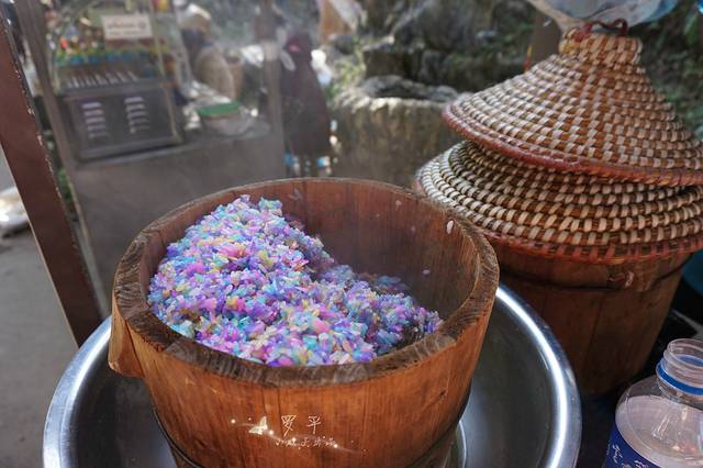 布依族的特色米饭——五彩花米饭,据说是当地人用各种植物颜料染成的,没有添加色素。看着这般五彩缤纷的色彩,忍不住买了一盒试试,米饭味道不错,但米饭中添加了糖,吃多了会感到有点甜腻。