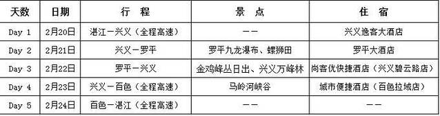 此次旅行一共历时5天,年初二出发,年初六返回。具体行程如下表所示: