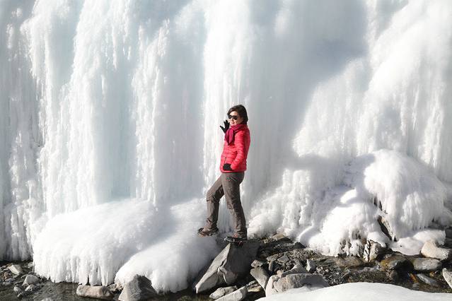我们看到冰瀑旁的雪山峰顶,万年凝结的冰川银光闪烁,山洞中挂着剔透发亮的冰凌,挺立着透明的冰塔、冰菇、冰塔林间,长风呼啸,其壮美令人叹为观止。
