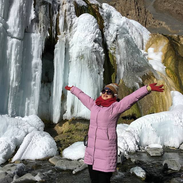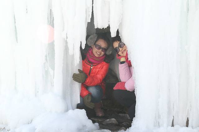 在朋友张军的带领下,我们沿着崎岖的山路,来到了七彩冰瀑,他高约10米多,宽约200多米,气势磅礴,蔚为壮观。夏季由于泉水中含有许多种矿物质,天长日久,水流经过处便形成了各种色彩的附着物,瀑布以纯净的蓝色、厚重的黄色、灵动的绿色、纯洁的白色等缤纷色彩,变成了玉珠堆砌的冰瀑,更是五彩缤纷,光彩夺目。因此又称其为七彩瀑布。