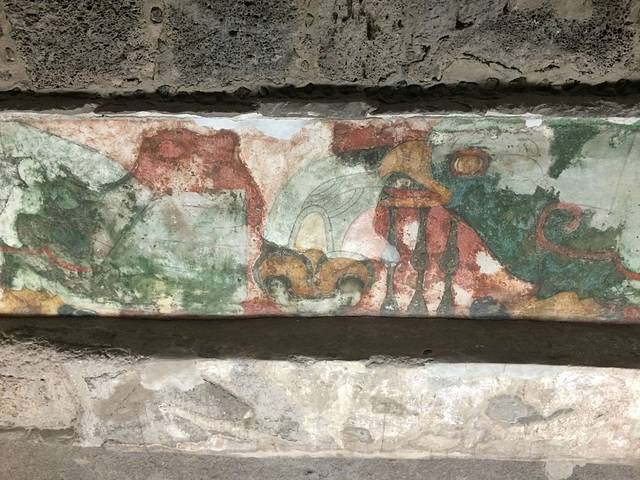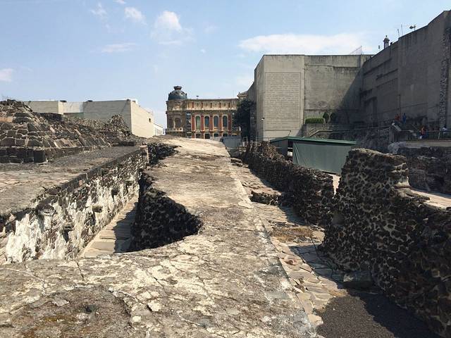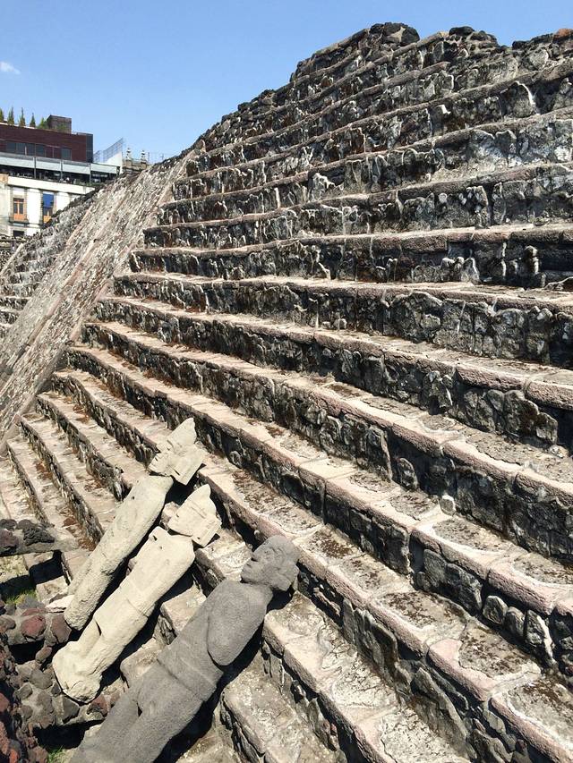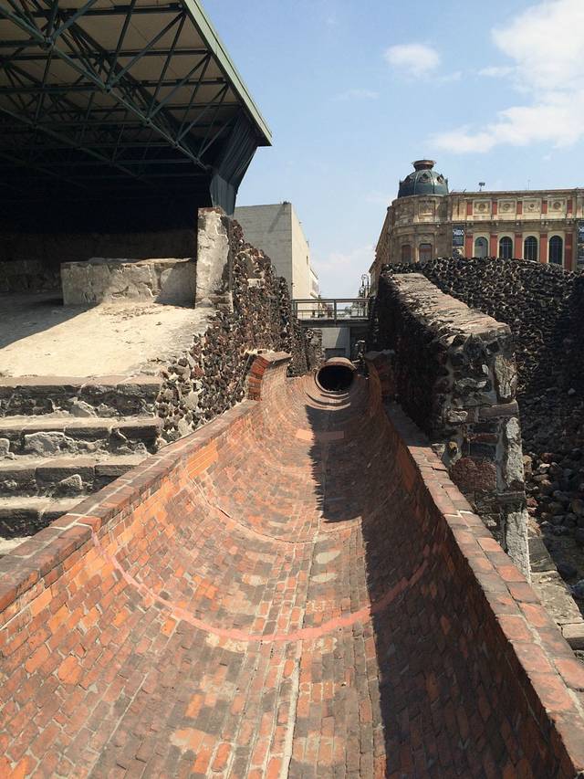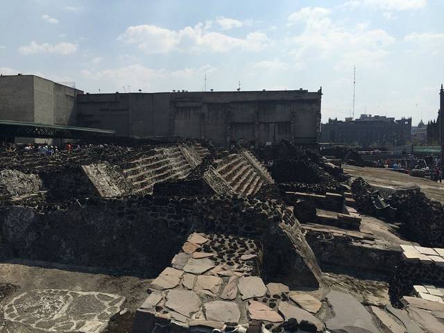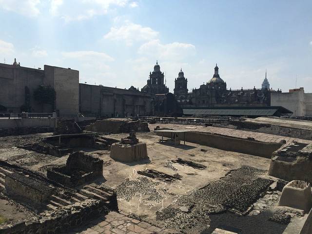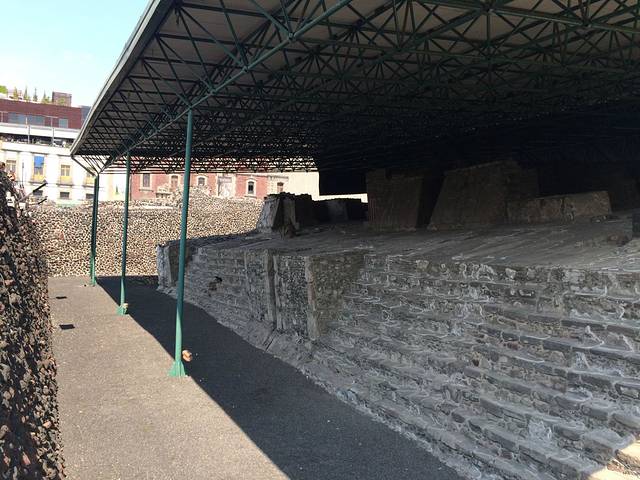 离国民宫最近的其实是大神庙的出口,入口要从大主教教堂边上过去,墨西哥大多景点对本国公民要么是全免要么是周末免费,所以尽量避开周末游览。大神庙是阿兹特克(14世纪-16世纪的墨西哥古文明,其传承的阿兹特克文明与印加文明、玛雅文明并称为中南美三大文明)帝国首都特诺奇蒂特兰城的中央神庙。遗迹是沿着专用步道顺次参观,仍有一些蛇头像和图腾像在日晒雨淋下保留了鲜艳的色彩。