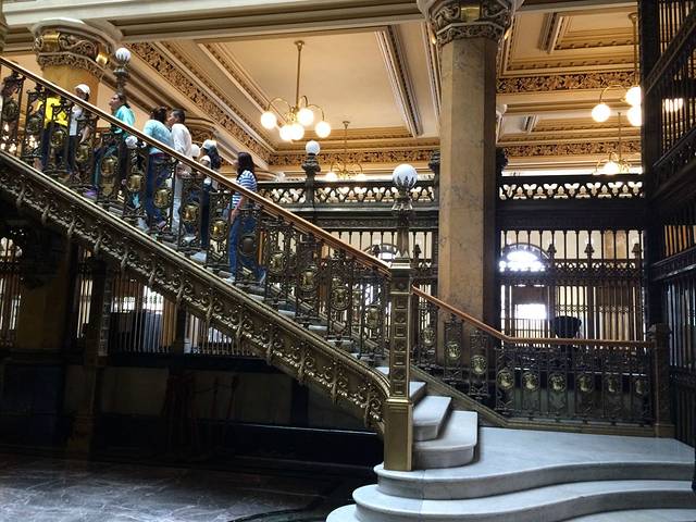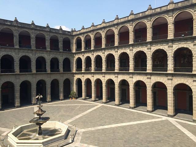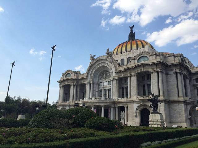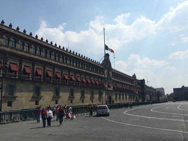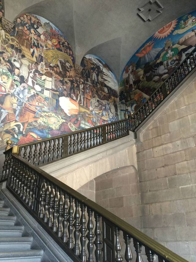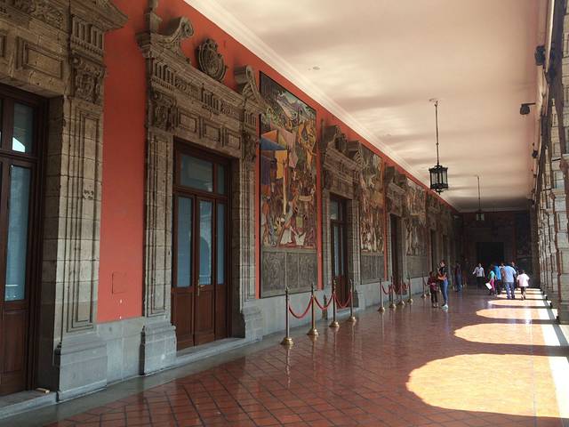 国民宫门口排队凭护照入场,最大的看点就是宫殿内部的大型壁画《墨西哥的历史》,从台阶正面两侧一直延伸到走廊,叙述了墨西哥从阿兹特克时代到现代的发展历程。每年9月15日国庆日的前晚,总统都会站在三层的中心阳台面向宪法广场高呼“墨西哥万岁!独立万岁!”,集中在广场的数万市民会激昂呼应,翻版了1810年发表独立宣言时的情景。