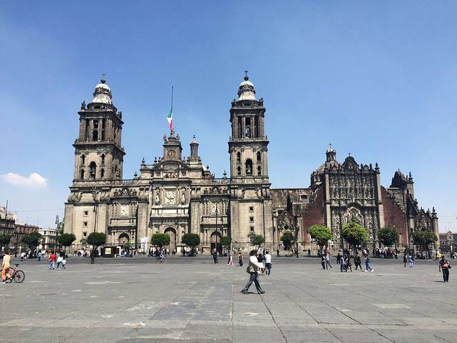 整个宪法广场原本是一座被阿兹特克帝国时代的神庙环抱的重要广场,16世纪被西班牙占领后,成为了整个西班牙殖民地的中心区。为了打破土著人的信仰,阿兹特克帝国的神庙建筑遭到了严重的破坏,被埋入地下,取而代之的是屹立至今的西班牙风格教堂和建筑。