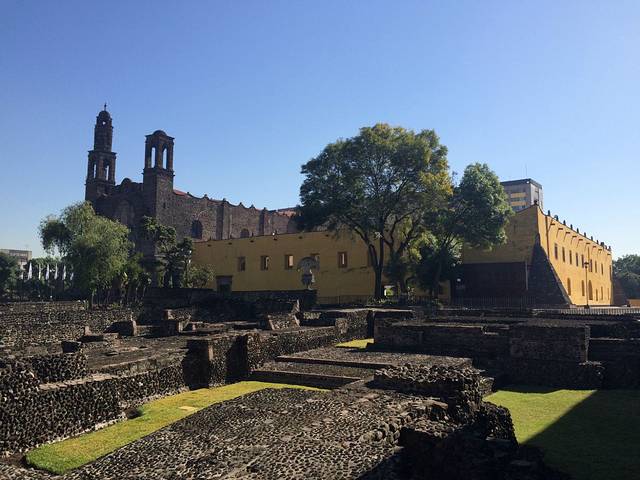 第一站三种文化广场,距离市区已经小有距离了。之所以叫三种文化,是因为在这个小广场阿兹特克时代遗址、西班牙殖民时期教堂与周围现代的高层建筑群并存,也象征着多种文化共存的墨西哥历史和这个非常混血的国度。