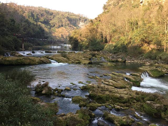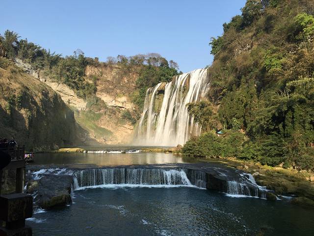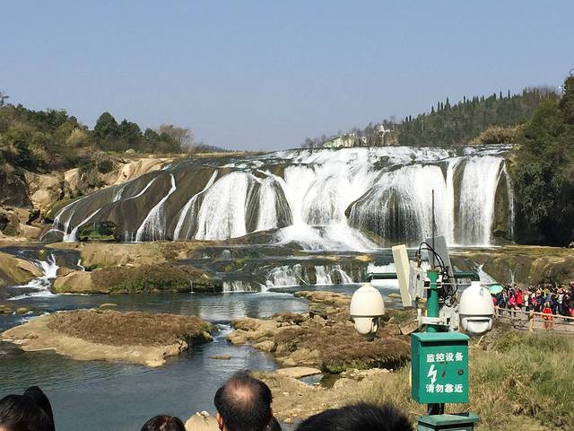 黄果树里面有3个大景点,每个景点距离都很远,所以没有自驾的都必须去租的士或是坐观光巴士。攻略上说观光巴士要等到人满才开车,为了不浪费时间,我们选择了的士,其实价格都是一样每人50元,也很正规。最后总结选的士还是对的,观光巴士排队等车的人太多太多,很恐怖。司机凑多2位乘客一起将我们送到第一个景点-陡坡塘,是黄果树瀑布群中瀑顶最宽的瀑布。这是西游记片尾曲拍摄地。