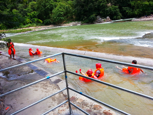 除却门票的费用外,水上广场的其他项目是收费的,比如人体飘流30元/人,橡皮艇飘流50元/人(一艇限坐2人);桃仙溪的水流落差不大,所以不必担心有翻船的危险,当然,救生衣还是要穿的,安全意识不能丢。