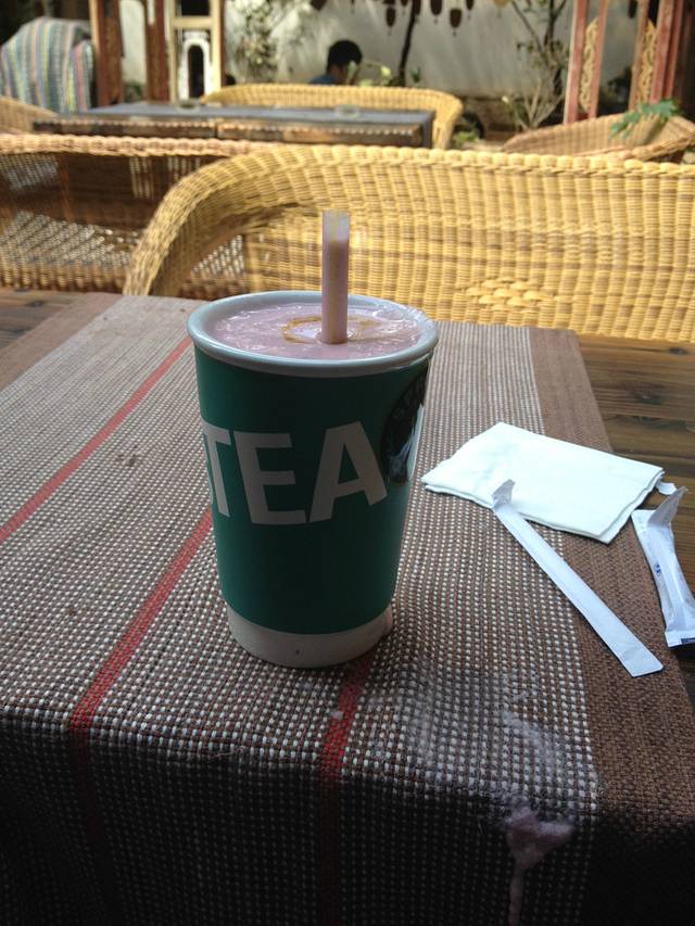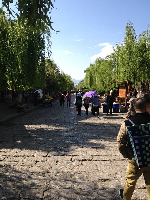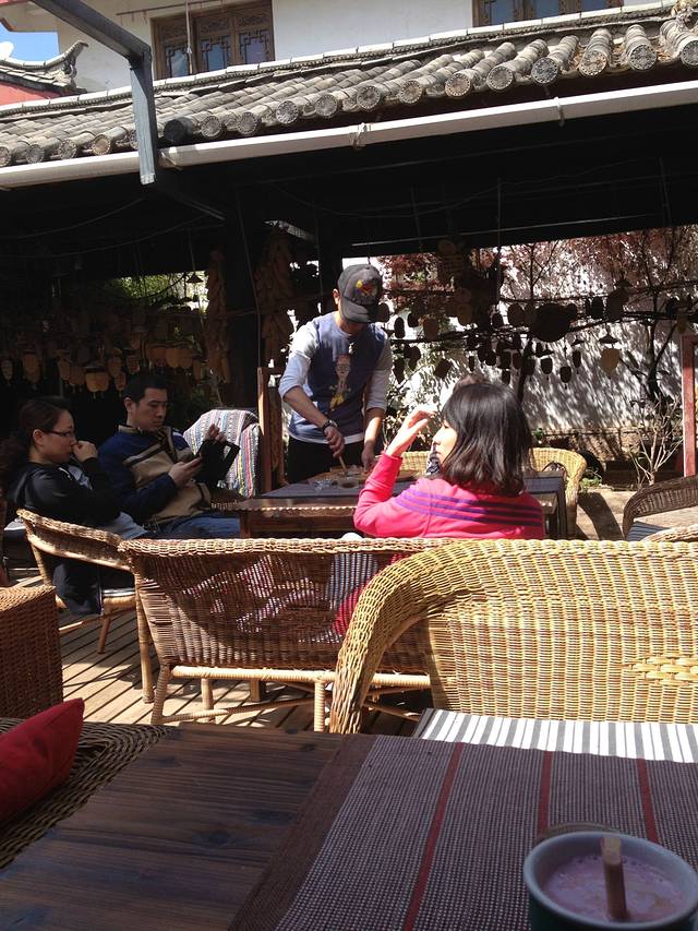 骑马两个小时后,就返回骑马场了,吃完午饭后,打电话叫车把我们送到玉龙雪山脚下的美丽的束河古镇,无论是司机师傅,还是马夫,船夫,和烤鱼师傅,都是当地的纳西少数民族,很帅,很热情,束河古镇相对人少安静,由于太累太热,没怎么去逛.我们就走进一家咖啡厅休息了了,各自点了东西,我点一杯蓝莓冷饮,休息了半个小时后离开咖啡厅,简单逛了一圈 就离开古镇.