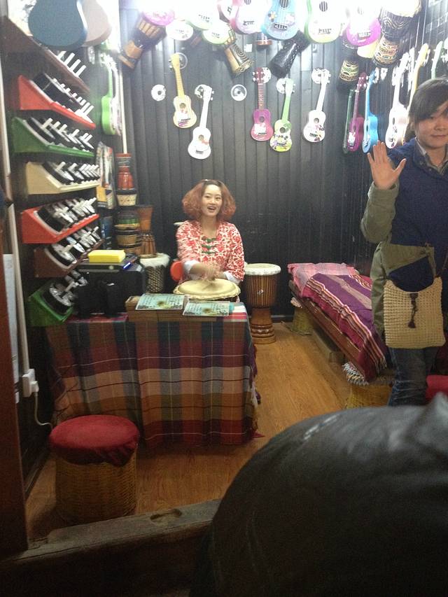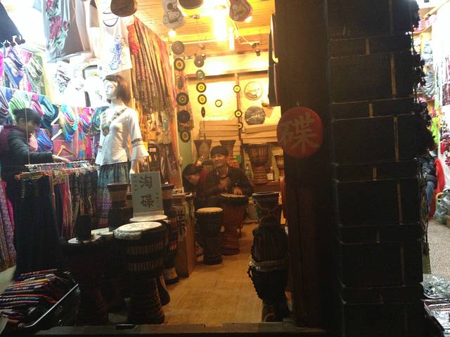 古镇街道 随处可见的这种鼓店而且音乐放着歌手小倩的"一瞬间"加上敲鼓,很好听.