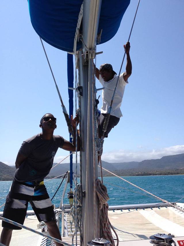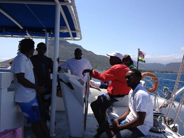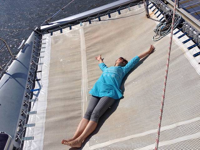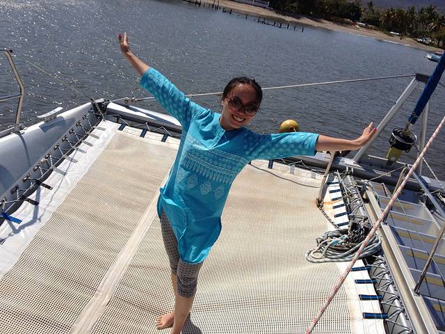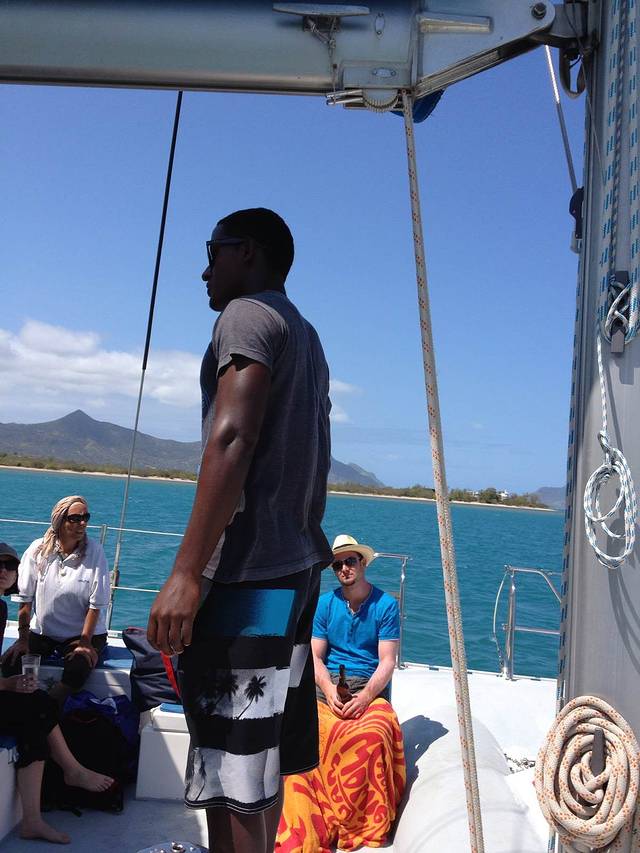 出海看海豚喽 到了毛球在expedia上预定的 100美刀一人 含酒店接送 七点多从北边我们住的酒店拉到西南海港 一路在南北大动脉M2上堵了2小时才到 毛球人民早晚高峰堵车也是伤不起啊 还好有车接到海港 不然一大早的堵车加找路有够小伙伴们受的 出海的是双体船 船上除了和我们一起的2对老外和我们的领队以及船员们外都是中国人 一个中青旅的团和一个考察团 岸边水浅 搭小船到深水处上双体船 一上船小伙伴们就在船头晒太阳的帆布上站着坐着躺着滚着 各种耍宝各种摆拍