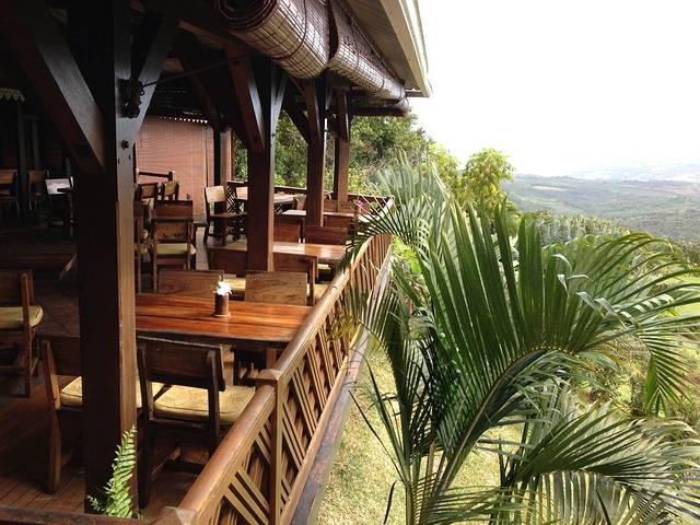 离开圣水湖 小伙伴们总算同意让我开车车啦 好开心好兴奋 还有大路上手 到了第一个路口左转就晕啦 雨刷器当转向灯走起啦 还习惯性的左转到人家的右车道上 没想这个转弯之后就进入弯弯曲曲的山路了 我对左边的距离还无感呢 只能两个小耳朵左顾右盼 看车后的线来判断是否偏左了 视线不好的弯道好怕会车 总要滴滴 没开多久就进入黑河峡谷森林公园了 景色很美 还不时有猴群出现 正好放慢了速度看景 猴子长了浓密的白胡子 还拖着个白尾巴 像是花了妆的猫咪 N个弯道之后遇到了一家庭院深深的餐馆 果断停车用餐 不知不觉中都下午三点了 小伙伴们都饿过啦 此行运气很好 没来及提前做餐馆的功课 总能遇到trip advisor推荐的餐馆 这家就超赞 看山谷的美景位置绝佳 菜也色香味俱全 还惊喜的遇到了据说快绝版的椰子芯汁儿做得鱼 虽然鱼没货了 给我们换了个做法做了海鲜拼盘 还是满足我们单上了椰子芯汁儿 味道鲜极了
