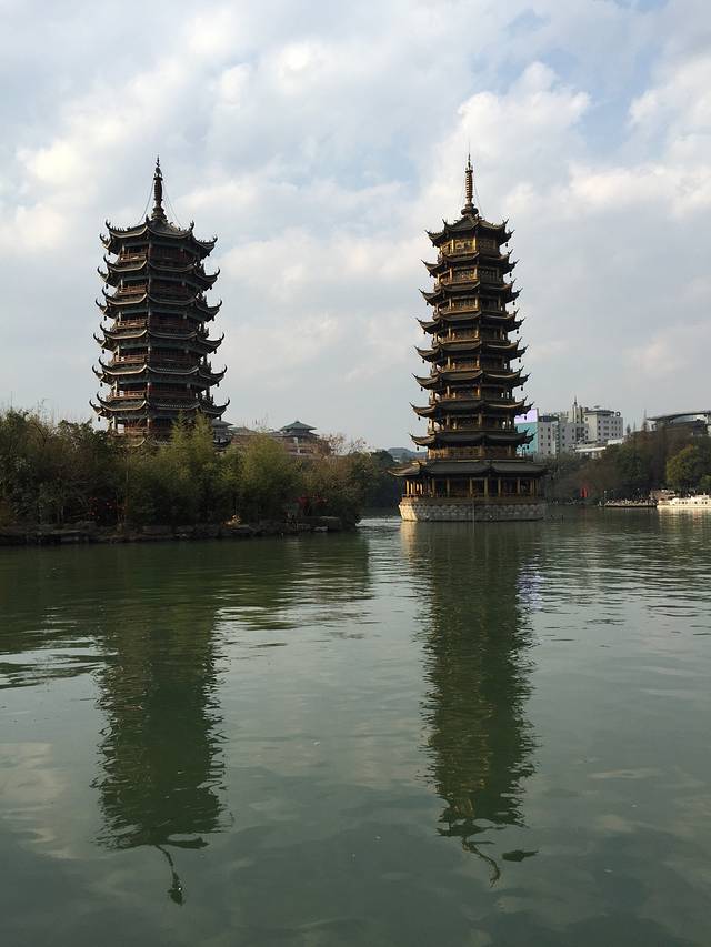 日月双塔是在唐代佛塔的基础上重建的。坐落在桂林城的中轴线上,日塔号称世界第一铜塔,月塔为琉璃塔。