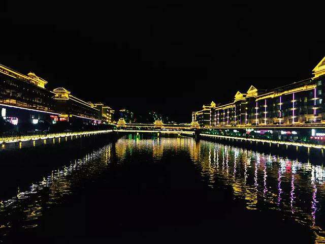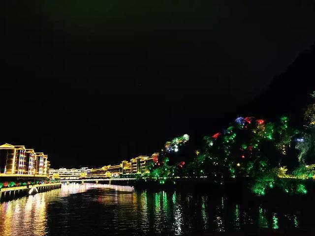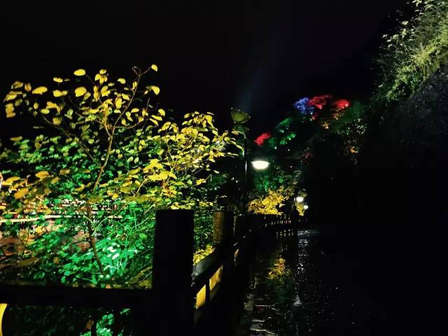 回望刚刚走过的地方。河边丛树也被点缀了星星点点的灯光,如梦幻一般。