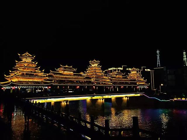 站在通道廊桥上便能见此盛景,有点气势磅礴的感觉,但又只是普通的不能再普通的民房还有对面的一座廊桥合围而成,大抵是这灯光的效果。夜幕中的通道更美,灯光让生冷的白墙黑瓦变得如此绚丽夺目。于是我便望此景而去,继续探寻对面是否有不一样的东西。