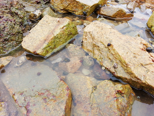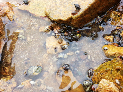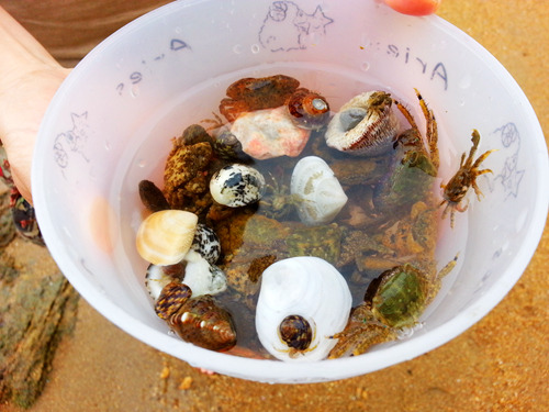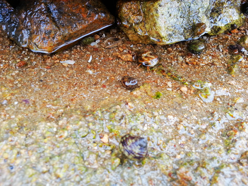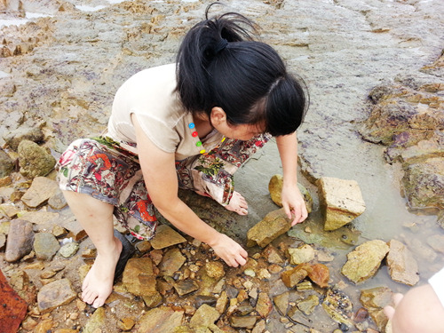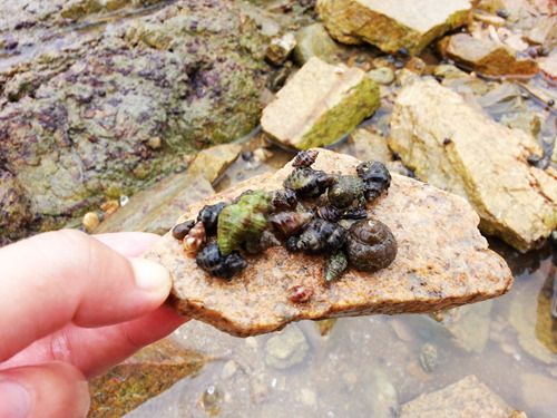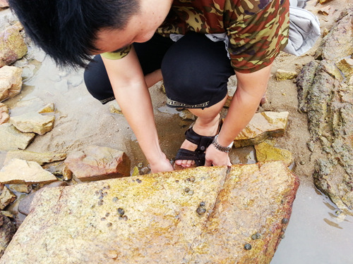翻开焦石上的石块,大量的螺、蟹等生物暴露在我们眼前,嘿,拎上小水桶,行动!!