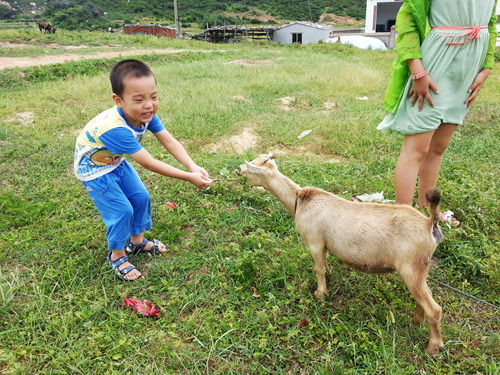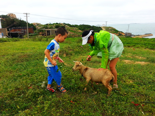 刚上岛就看到一艘完成打捞作业的小渔船正在清理战利品,满船的小鱼儿银烂烂的亮花双眼,小黑桶里装满了从鱼堆中翻捡出来的小鱿鱼;从岛上眺望大海,风光无限。岛上的原住民不多,到处可见牛羊等家畜,对博这样的动物控来说老激动了。从码头到大澳海滩差不多有一公里的路程,快到海滩的一段小路两旁的松树挂满了丰硕的松果;