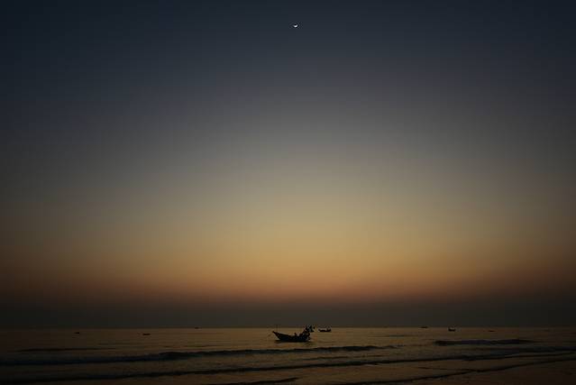 恰好是远方落日下飘过的船只,荡起的海浪。