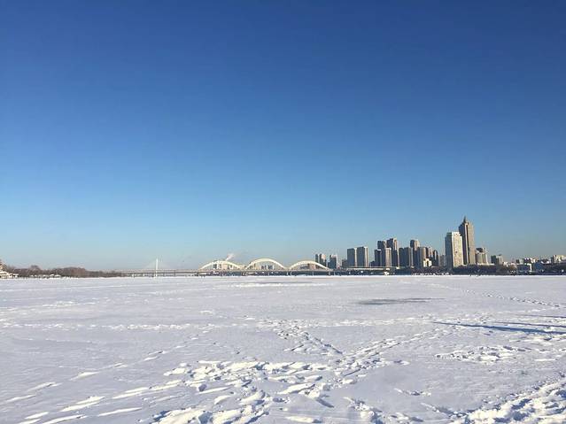 我们是从中央大街一直走到松花江,然后横穿松花江去的俄罗斯风情小镇。松花江里的冰冻的很厚实,完全不用担心。