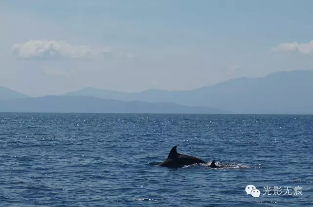 有时成群的海豚会游到船头,向我们发出它们特有的声响,在水下若影若现和船的倒影一同飞翔。