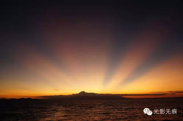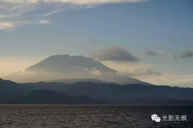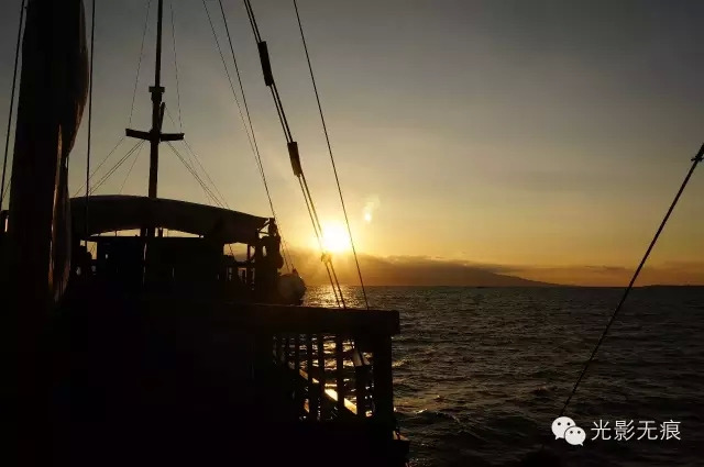 夕阳打在远去的龙目岛上,映出的金色霞光