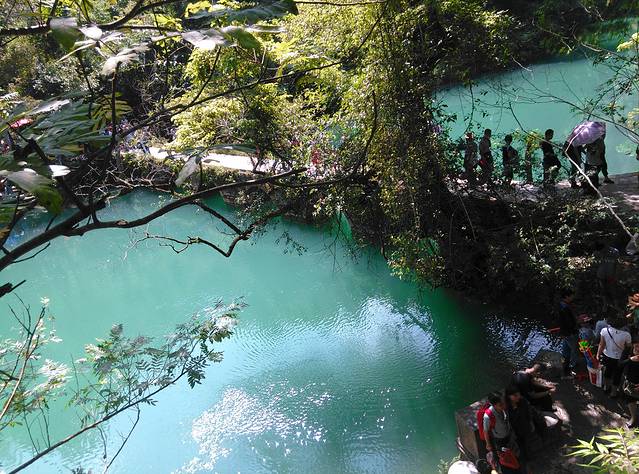 没过多久就到小七孔啦,一路上水真的很漂亮啊,翠绿翠绿的,小七孔也同样,美美美。小七孔那条桥上人好多,