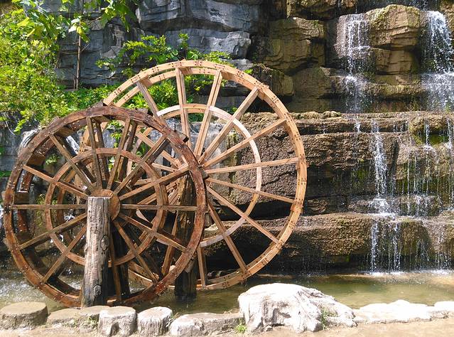 一进去,水车、石道璐、大桥、绿树、江水好生惬意