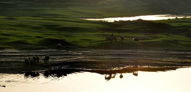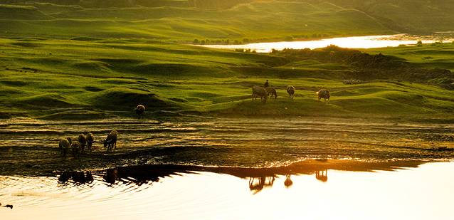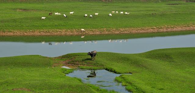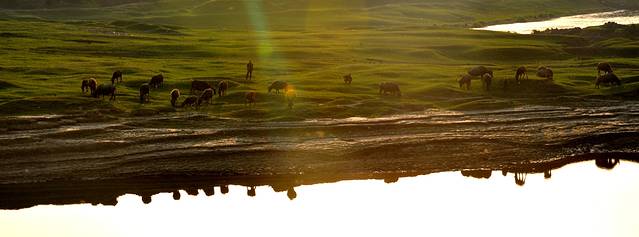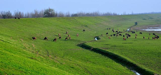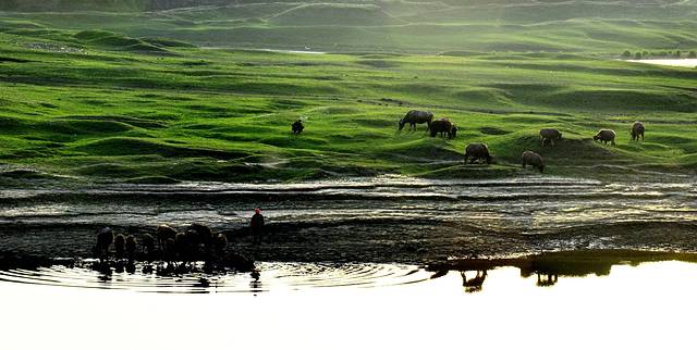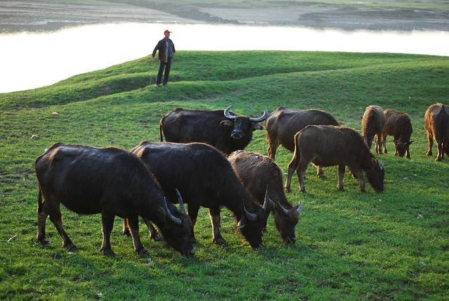 下午,我们一行来到了澧水江边,观看“百牛过江”特色景观。一到江边,一行人就异常兴奋,早晨初升的太阳给江面镶上了一道橙黄色的金边,“来了,来了……”牛群下水时,母牛和小牛紧随其后。数分钟后,带头牛率先下水,群牛登岸的场面瞬间掀起现场高潮,摄友们拿出相机啪啪啪地记录下这个激动人心的一刻。我们倒是激动,这些牛儿却非常“淡定”,有的安逸的享受早餐,有的在江边自由奔跑,丝毫不受影响。