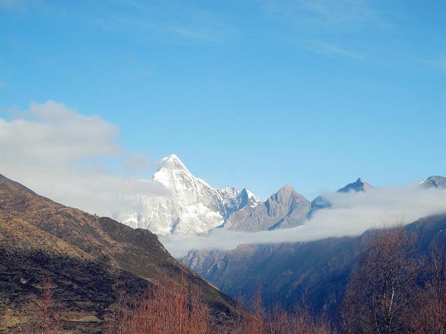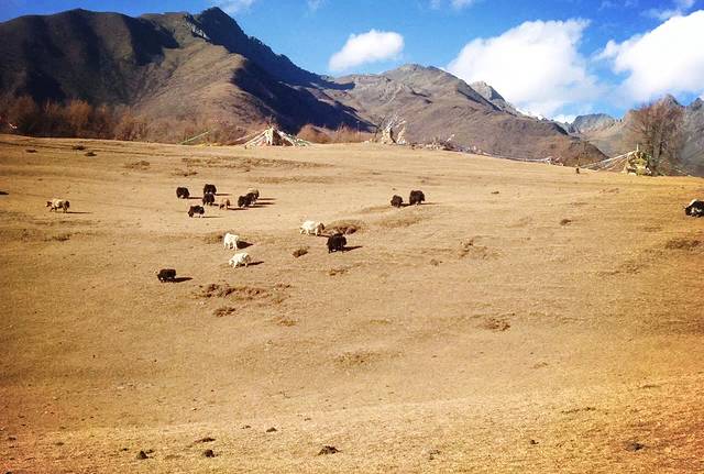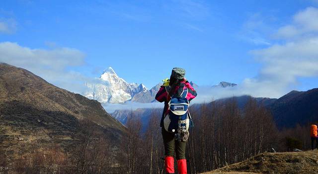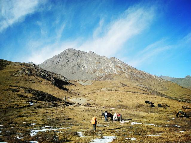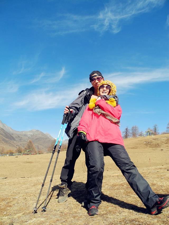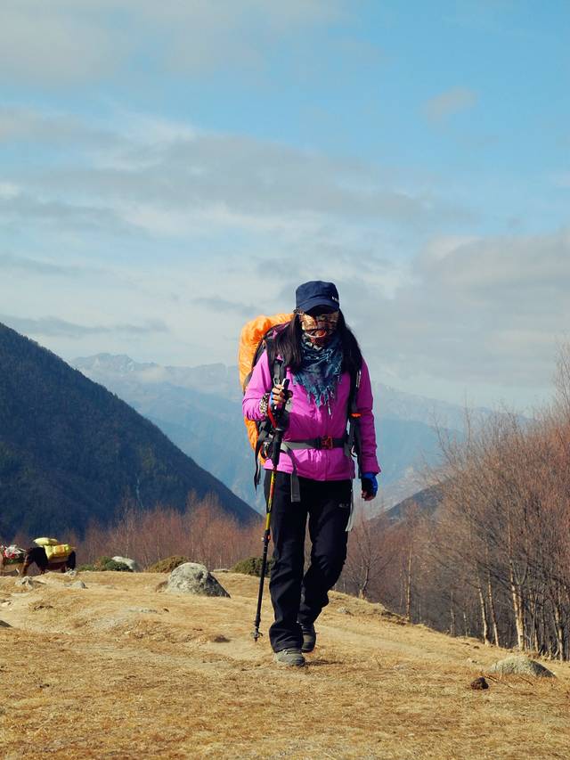 12日一早,吃完三嫂做的土豆牛肉面后,满心欢喜的出发了。从日隆镇到大本营,海拔将上升1000米,徒步七八小时的路程。为了保证第二天冲顶的体力,因此集体决定马驮包,轻装徒步。而倔强的Tracy坚持自己背包(我本也打算坚持背包徒步,但考虑到我的背包确实有点重,便放弃了。)还好她的背包较轻,不过背包徒步也属不易。最终,神仙、飞鱼、老杜选择骑马,其余六人则徒步。