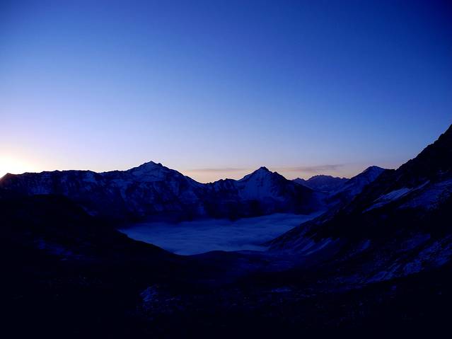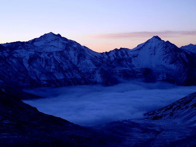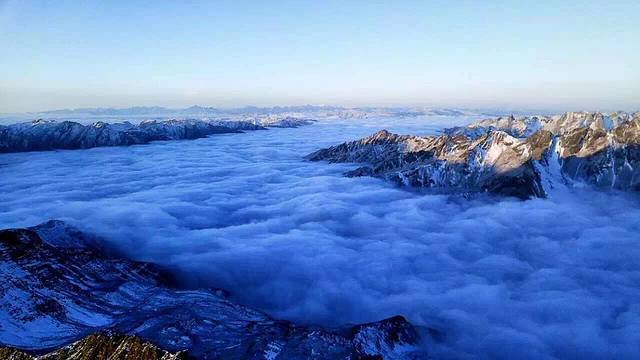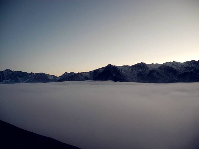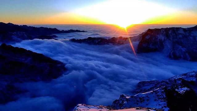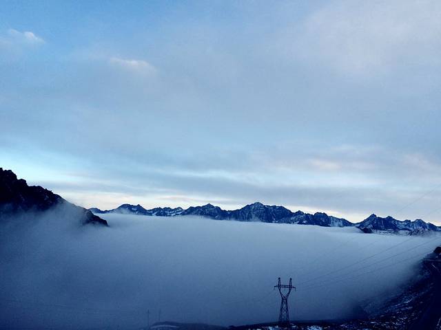 一上车,便期待着快一点冲出这雾霾重围,重见天日。殊不知,冬日里的四川盆地,浓雾笼罩的地方太广,即使过了汶川,虽没有了霾,浓浓的雾气却是有增无减。让一行想要看蓝天的人儿难免有些失望。在翻越巴郎山(海拔4480米)时,浓雾大到能见度几乎0米,“云里雾里”一词的表意是此刻的写照。行驶在一圈圈的绕山路上,既看不见天,也看不见山,唯有浓雾一路相随。就在以为今天见不着天时,车子如同冲出重围般,一瞬间群山尽显,夕阳余晖正映衬着雪山,巴郎山间的云海如同仙境般美妙绝伦。大家不约而同的惊呼起来。这绝对是今天最大的惊喜。开车的周师赶紧将车停在路边,让我们下车近距离去感受这大自然的神奇与美妙。