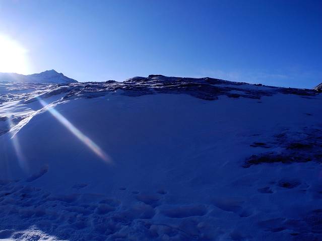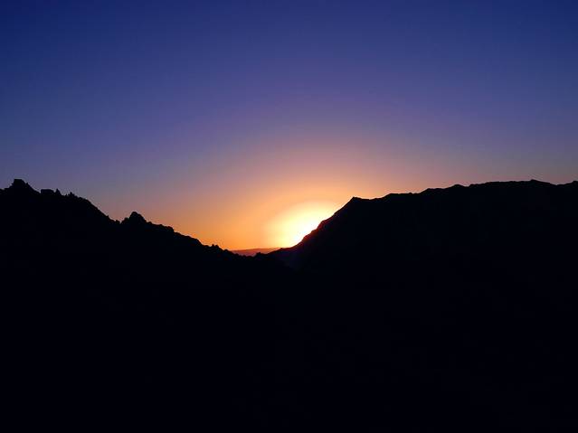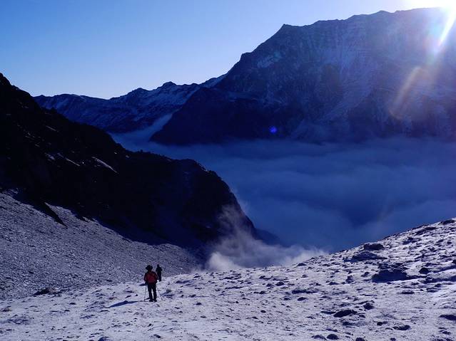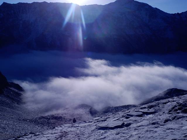 终究脚步停留在了距离二姑娘之顶还有300米海拔的地方,出于对大自然的敬畏,对生命的珍惜,遗憾而又艰难的从300米到顶点处转身而下。站在悬崖峭壁间,仰望着那不见顶端的二姑娘,俯视着群山间的云海仙境,寒风阵阵,眼眶里一阵暖流打转,心里是伤心的,也是无奈的,因为原本完全可以登顶的Tracy和坚持一下也能登顶的老杜也只有跟着下撤;也因为在体力达到极限时,我心里想的是,不会再来亲近二姑娘了。。带着遗憾下撤中,日出渐渐照耀着这片桀骜冷艳的群山,白雪皑皑的大姑娘就在眼前,傲立在云海间,不为周遭一切所动容,美的让人敬畏。
