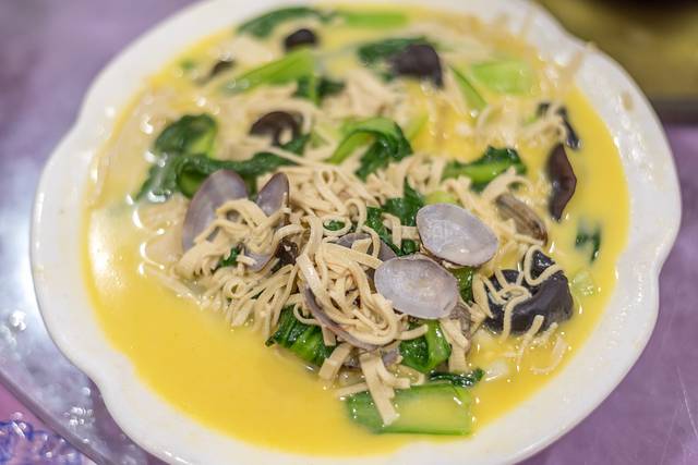 距离南京一百多公里外的扬州,以扬州菜为代表的淮扬菜系名扬全国,刀工细腻口味清淡,大煮干丝就是淮扬菜的代表作。这家店里加入了海鲜,使得汤汁味道更加鲜美。