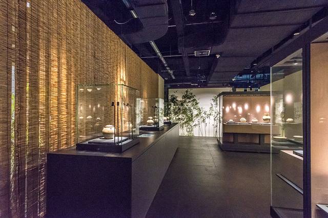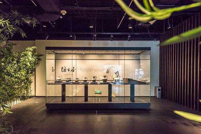 瓷器摆放在中间的展示柜内,四壁竹影婆娑,配合着柔和的灯光,感觉到清幽,高雅。