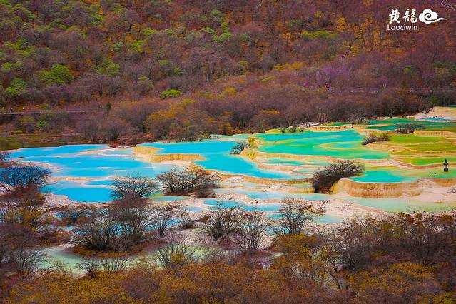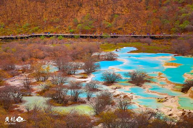 从远处看黄龙的五彩池更加壮观,到了秋天附近的树叶变红变黄,蓝色的五彩池宛如碧玉一般,铺满在山上,层层叠叠。呈现出又蓝又绿的景象。